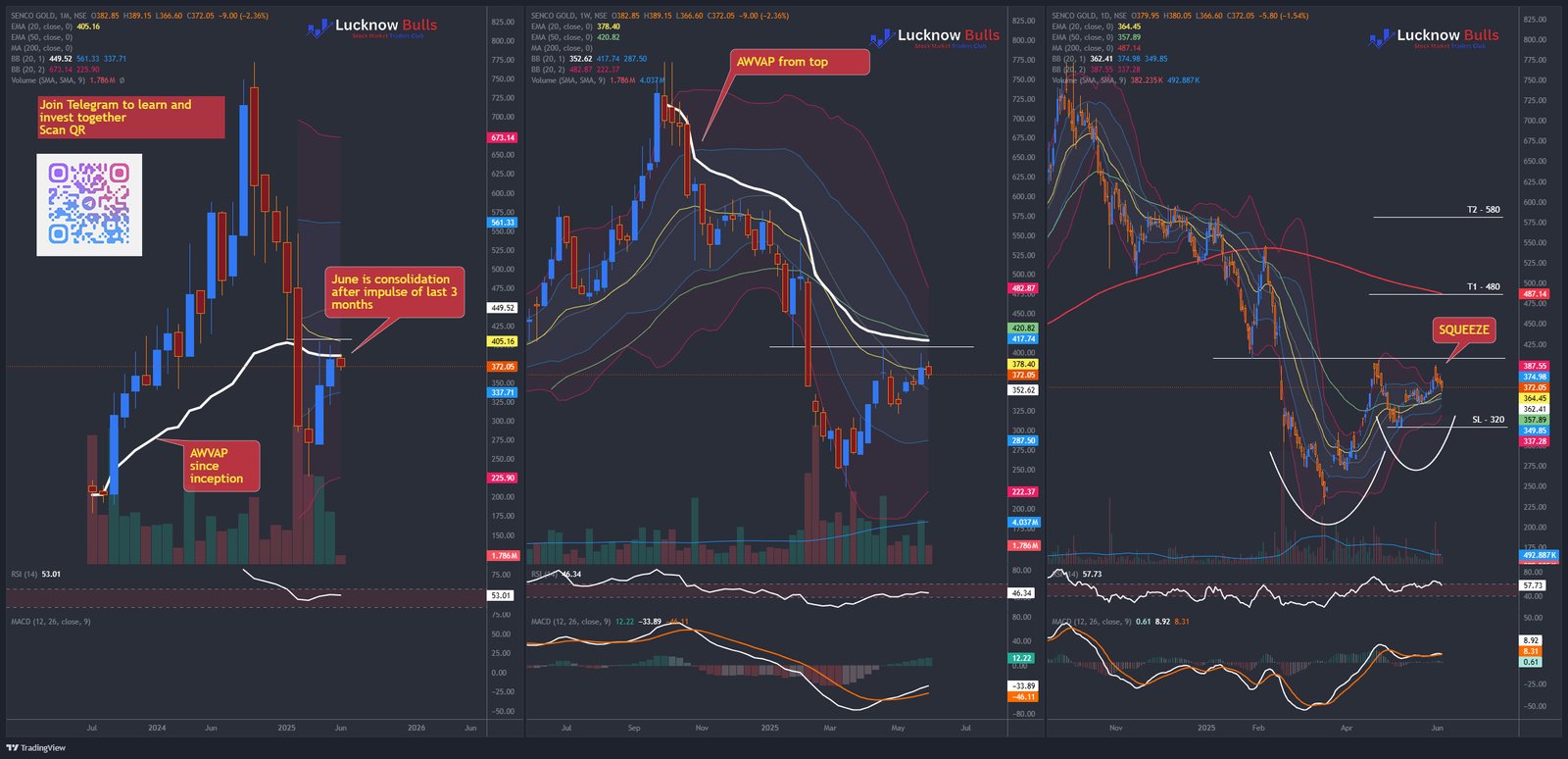 - Daily chart shows that Cup & Handle in progress and stock is gathering momentum to take down recent highs of 400s, with 1st target as 480 and 2nd target as 580 and STOP LOSS as 320, with Risk Reward ratio of ~ 2